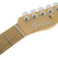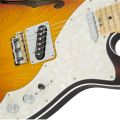 [Índice]El primer contacto visual con la guitarra no decepciona, el brillo del barniz y los acabados delatan que no se trata de una guitarra de gama humilde. El modelo exacto con el que pudimos trabajar es el que tiene un acabado sunburst de tres colores, perfectamente aplicado y que dejaba ver unas vetas que embellecen el instrumento, conservando en todo momento el aire clásico y dando movimiento a la tapa según la luz recae sobre ella. En general, se han respetado las líneas estéticas habituales de las Telecaster Thinline (salvo por la placa asimétrica de atornillado del mástil), por lo que los amantes del modelo no se sentirán decepcionados. El golpeador perloide nos parece un gran acierto que le añade categoría al modelo y los detalles en negro de la pastilla del puente y el capuchón del selector de pastilla ayuda a que el contraste de colores del instrumento sea aún más notable. Con lo que no estamos muy convencidos es con la tipografía empleada en la inscripción "Noiseless" de las pastillas, especialmente la del puente. Es un detalle muy pequeño y difícil de ver a distancia, pero no hemos podido evitar reparar en él por lo poco acorde con el resto de la estética.