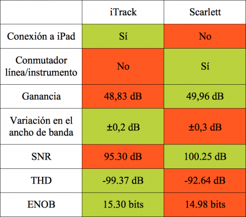 Realmente las diferencias son sutilezas: son en realidad dos interfaces muy similares en cuanto a prestaciones y musicalmente nos van a permitir lo mismo (con la diferencia de que si usamos iPad debemos optar por la iTrack). Si hilamos muy fino, la Scarlett tiene un poco más distorsión armónica lo cual empeora ligeramente el ENOB, pero ello no significa que no sea una interfaces apta o que sea mucho peor (de hecho, es mejor en cuanto a ruido de fondo).