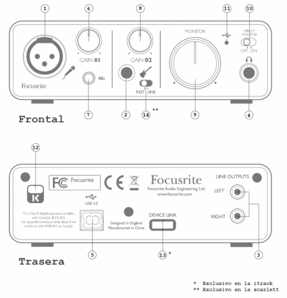 Además, los controles de ganancia se iluminan de color verde en presencia de señal a la entrada, y de rojo cuando dicha señal supera el volumen máximo permitido (clipping). Un pequeño led (11) nos indica con una luz verde cuando la interfaz está correctamente conectada al ordenador (No se enciende hasta que no se han instalado los drivers y la interfaz es reconocida por el ordenador). Finalmente, ambas interfaces disponen de un enganche (12) para asegurarlas en una estructura si es preciso (anti-robo).