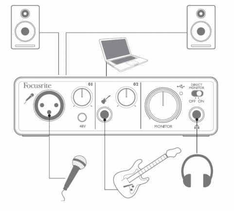 [Índice]Quizás la configuración más completa es la que se muestra en la figura. En ella podemos ver que la interfaz es el centro neurálgico de nuestro equipo. Por una parte, podemos conectar un micrófono y una guitarra en sus entradas correspondientes. La guitarra (o el bajo) podría conectarse directamente a la entrada de instrumento o en el caso de la Scarlett también podríamos conectar la guitarra con un ampli o un pedal de distorsión de por medio, y empleando el nivel de línea si es necesario. Luego podemos conectar unos monitores autoamplificados a la salida de línea y unos auriculares a la salida correspondiente. Finalmente, desde nuestro ordenador (o iPad en el caso de la iTrack) podemos disparar en playback una base de batería desde nuestro DAW favorito a la vez que grabamos lo que tocamos y/o cantamos.