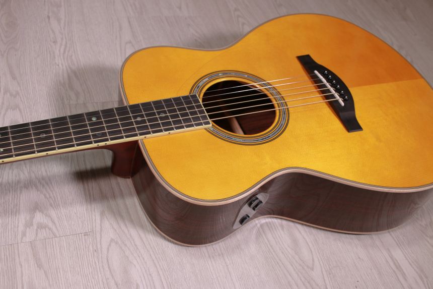 [Índice]La unidad que pudimos probar fue la LS TA en acabado Vintage Tint, una guitarra tamaño concierto que presenta las mismas características técnicas que su hermana LL TA, esta última de formato Dreadnought. Externamente, son guitarras que no necesitan de ornamentaciones complicadas para alejarse de los instrumentos de gama económica: los clavijeros dorados desprenden un aire lujoso, el brillo del barniz es muy atractivo y las decoraciones en nácar de la boca son moderadas y vistosas a la vez.