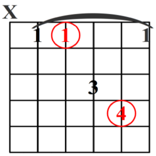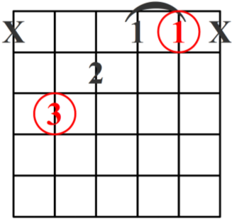 Por ejemplo, si ubicamos la primera posición de modo que el dedo #1 quede en el tercer espacio, tendremos un Re aumentado (Daug o D+), ya que las notas circuladas (en la segunda y quinta cuerda) quedarían en los espacios #3 y #5, respectivamente, los cuales corresponden a la nota Re. Sin embargo, el acorde aumentado, al ser un acorde simétrico, presenta un dato interesante: Cualquiera de sus notas puede ser la nota fundamental. ¿Por qué? Porque toda su construcción se basa en terceras mayores—un solo tipo de intervalo para el acorde. De modo que el ejemplo anterior puede ser un Re aumentado (D+), Fa sostenido aumentado (F#+) o La sostenido aumentado (A#+).