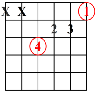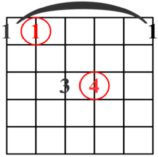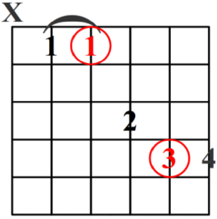 A continuación algunas posiciones de acordes aumentados. Estas posiciones son movibles, lo cual significa que el nombre del acorde va a depender de la ubicación de la posición en el diapasón. Utiliza los números circulados y en rojo como referencia para saber qué acorde es.