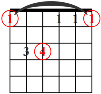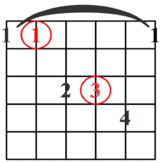 Al igual que la tríada mayor, una tríada menor es una acorde menor de 3 notas. Con frecuencia también se repiten notas para lograr un sonido mas grande. El Fa menor, ejecutado con cejilla en primera posición, es un ejemplo de esto, en el cual se ha triplicado la nota fundamental y duplicado la quinta. Nuevamente he utilizado colores distintos en la imagen para poder distinguir mejor las notas repetidas: verde para el Fa, rojo para el Do y azul para el La bemol.