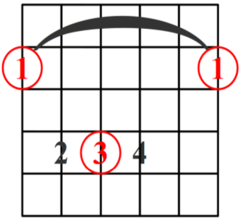 A continuación algunas posiciones de acordes disminuidos. Estas posiciones también son movibles, y su nombre dependerá de su ubicación en el diapasón. Utiliza los números circulados y en rojo como referencia para saber qué acorde es.