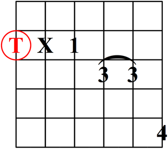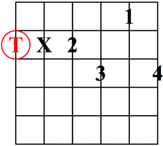 Fíjate que en la digitación anterior se sugiere el uso del dedo pulgar izquierdo (identificado con “T” de “Thumb” - pulgar en ingles) para pisar la nota en la sexta cuerda. Esto es opcional; bien se puede obviar la fundamental y conseguir el mismo “color” del acorde. Incluso, si estás tocando en un grupo con bajista, el bajo puede proveer la nota fundamental mientras ejecutas el acorde.