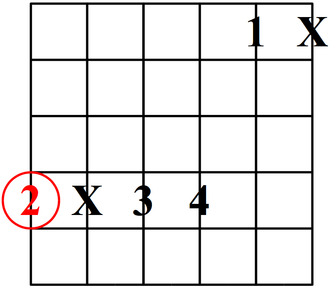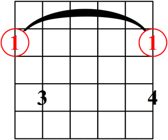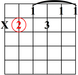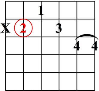Aunque en la digitación anterior marco con una “X” la primera cuerda, en realidad se puede añadir esta nota al acorde, pues corresponde a la quinta del mismo. En ese caso habría que hacer una cejilla con el dedo #3 a través de las cuerdas 3, 2 y 1 para poder añadir esa nota.