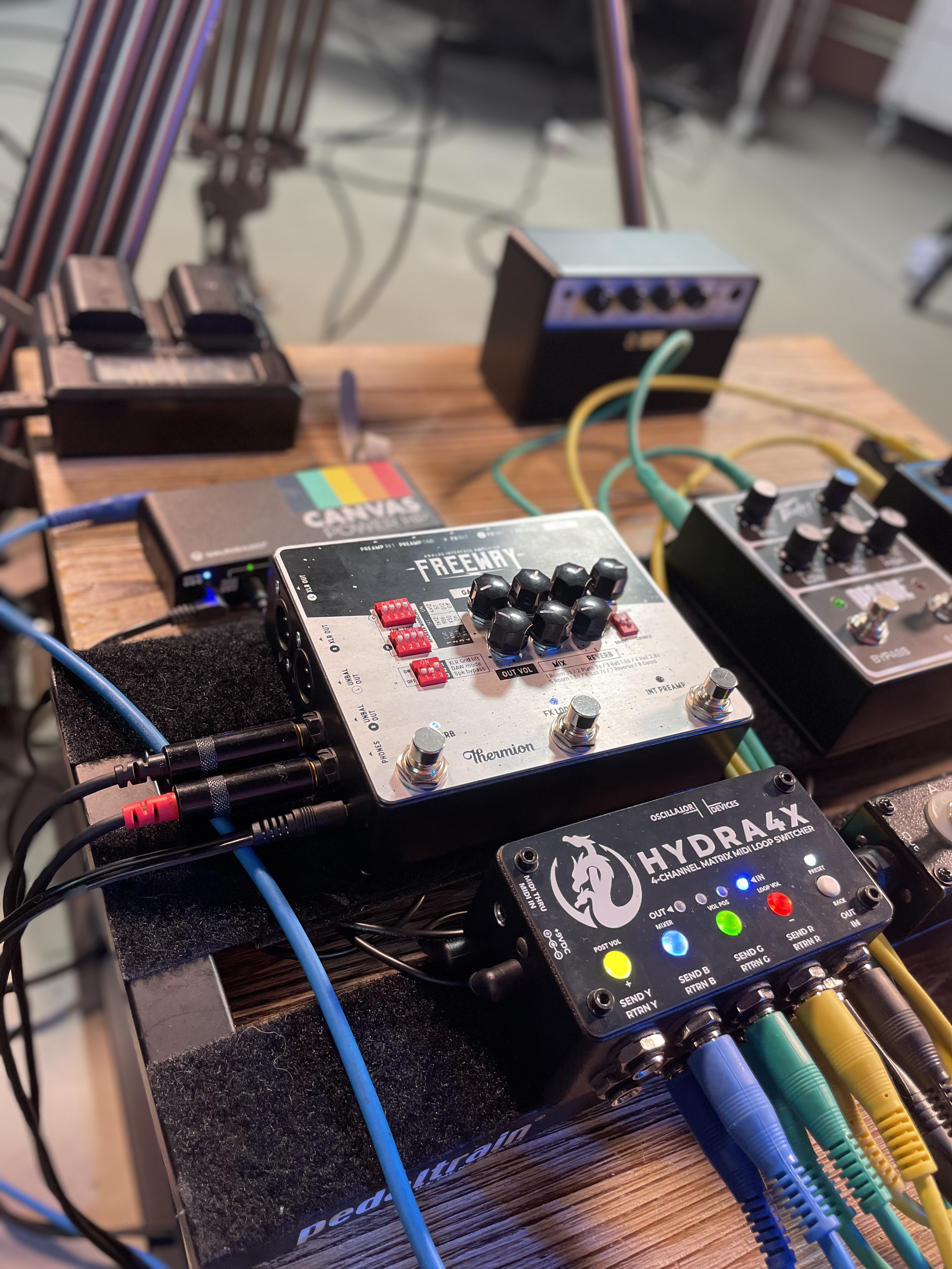 Para quienes necesiten tres canales distintos, el Freeway también lo hace posible. Con un switcher de pedales externo (MIDI o simplemente con footswitches incorporados) podemos asignar el preamp interno del Freeway en uno de los loops y se combina con dos o más preamps adicionales (pedales o cabezales). El switcher selecciona cuál de los tres entra en la cadena y el Freeway sigue aportando simulación de pantalla y reverb estéreo a cualquiera de ellos.